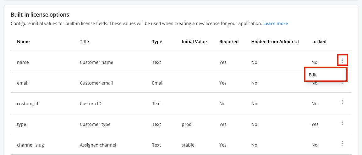 2. Under Built-in license options, open the menu for the license field where you want to set an initial value and click Edit.