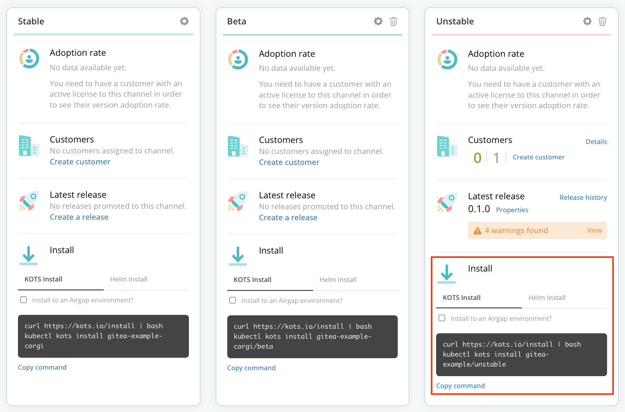 Go to Channels. From the Unstable channel card, under Install, copy the KOTS Install command.